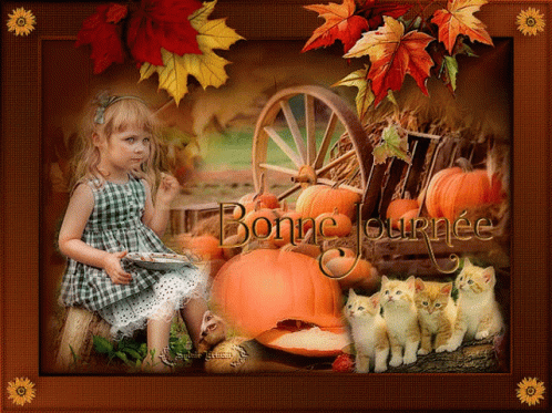 A charming autumn scene featuring a little girl, pumpkins, and kittens, wishing a good day.