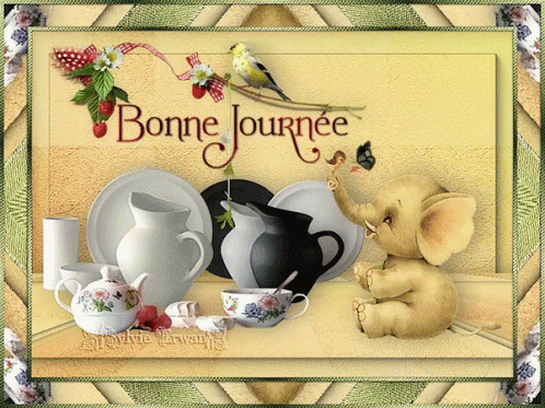A charming greeting card featuring an elephant, birds, flowers, and the French phrase "Bonne Journée."