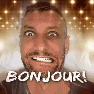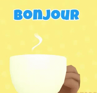 Jayjay, a cartoon man with glasses, sips tea from a cup with 'BONJOUR' text in the background.
