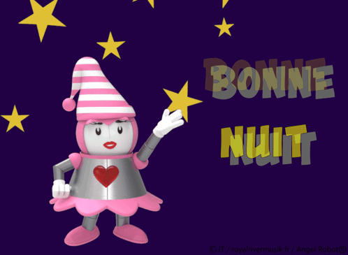 A cute pink robot with a heart on its chest wishes 'Good Night' among twinkling stars.