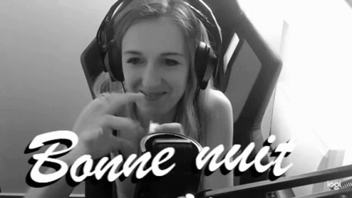 Nensha smiles with headphones, wishing 'Bonne Nuit' in this black and white ASMR-themed image.