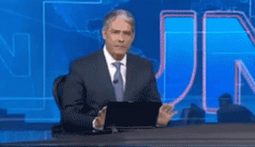 William Bonner gestures to calm down with 'CALMA!' appearing on the Jornal Nacional set, conveying a message to relax.