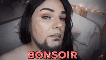 Gabrielle Marion, with makeup and a beard, says 'Bonsoir' directly to the camera.