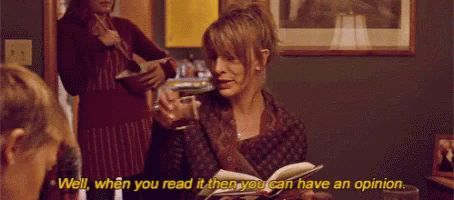 A woman reading a book states, "Well, when you read it then you can have an opinion."