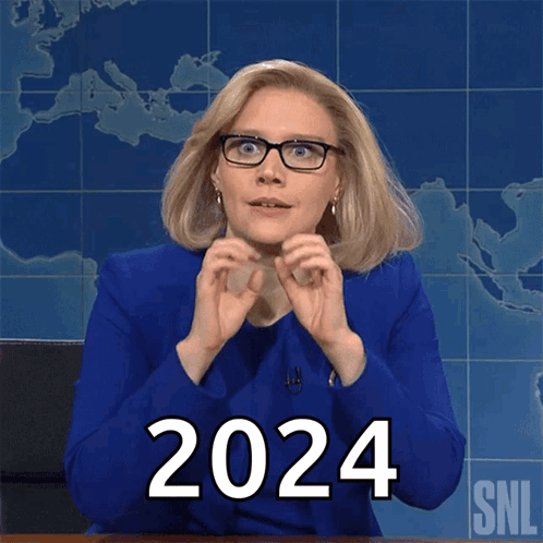 Kate McKinnon as Liz Cheney in a blue suit and glasses, emphatically saying '2024' on SNL.