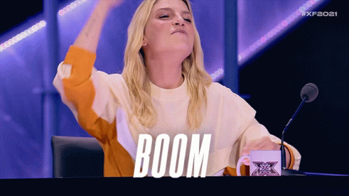 Emma Marrone reacts with an emphatic "BOOM" at Xfactoritalia 2021.
