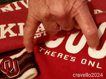 A hand points to Oklahoma Sooners merchandise, featuring the iconic 'THERE'S ONLY' slogan.