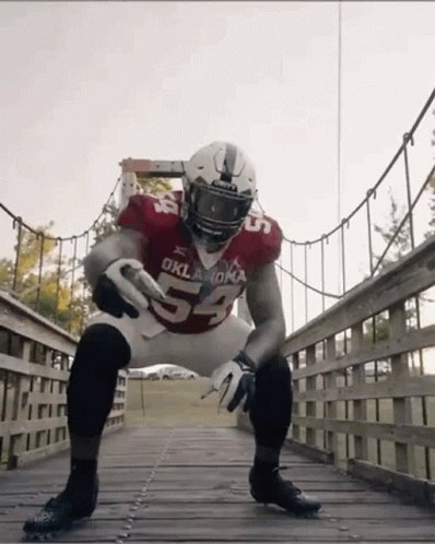 Oklahoma Sooners football player in uniform on a bridge, ready for action with OU and Jordan logos.