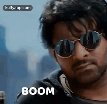 Prabhas in sunglasses with a 'BOOM' caption, looking cool and intense.