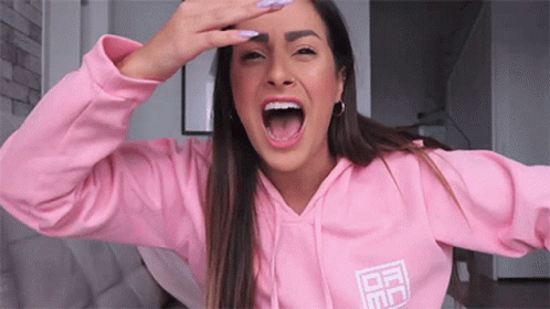 Nah Cardoso reacts with a shocked expression, mouth wide open and hand on her forehead, wearing a pink hoodie.