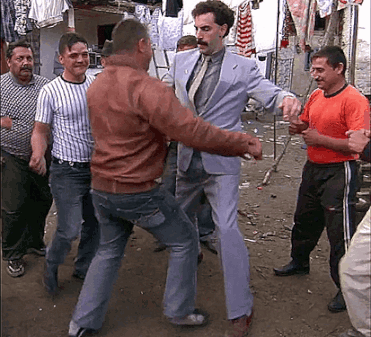 Borat Sagdiyev in his signature suit, enthusiastically dancing with a group of men in a village setting.