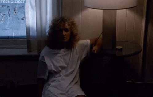 Glenn Close as Alex Forrest in Fatal Attraction, looking bored and frustrated as the lights turn on and off.