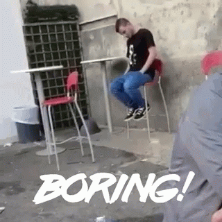 A man, seemingly bored or asleep, dramatically falls off a high chair, with 'BORING!' text overlay.
