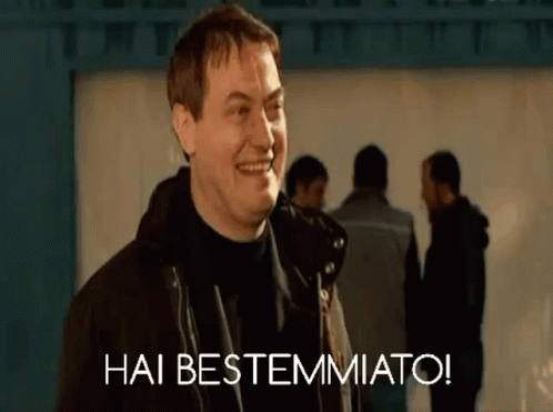 Boris Proda smiling and exclaiming "Hai Bestemmiato!" (You have blasphemed!) in Italian.