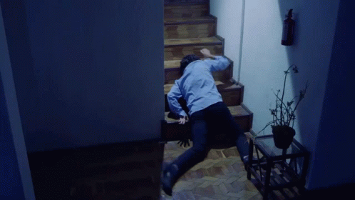 A man falls down a staircase, appearing drunk or weak, in a scene from Enchufe Tv's 'Borracho' sketch.