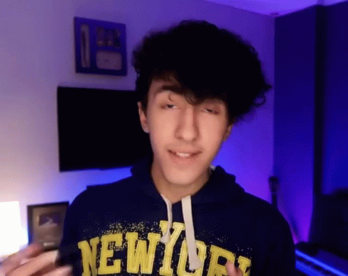Young man in a New York sweatshirt sends a charming flying kiss to the camera.
