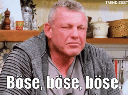 Andreas Robens expresses strong disapproval, repeating 'Böse, böse, böse' with a serious face.
