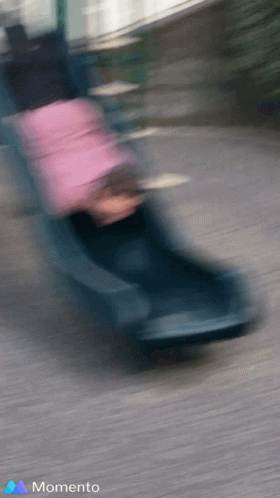 A person in a pink jacket slides down a playground slide face-first in Bosnia, captured with Momento.