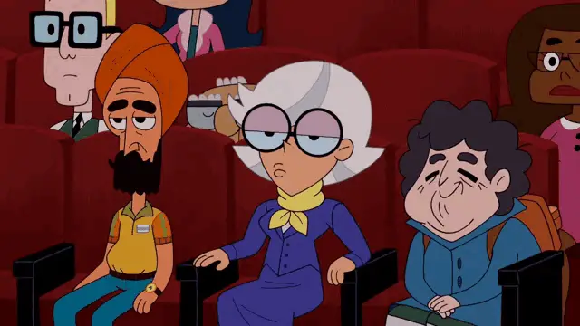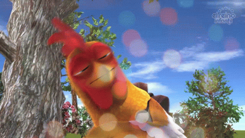 El Gran Gallo, the cartoon rooster from El Reino Infantil, yawns widely in a sunny outdoor scene.