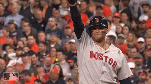 Rafael Devers celebrates a play for the Boston Red Sox, raising his arm to the cheering crowd.