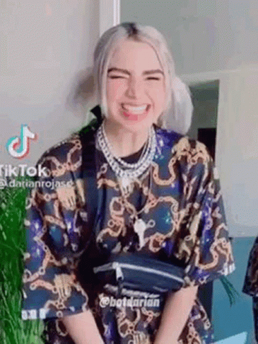 Bot Darian shows playful expressions and poses for the camera in a patterned shirt and pigtails.