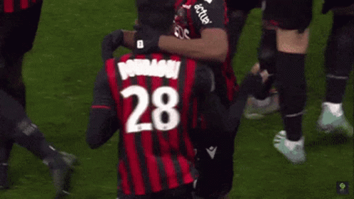 Hicham Boudaoui, wearing jersey number 28, celebrates a moment on the soccer field with a teammate.