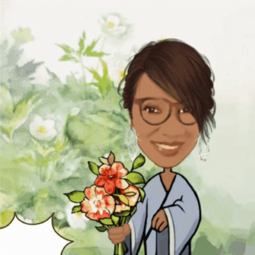 Boulenin Adjoua, a cartoon woman, smiles while holding a vibrant bouquet of red and orange flowers.