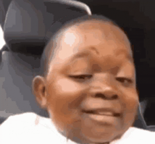 A close-up of a cute baby making a funny, mischievous face while sitting in what appears to be a car seat.