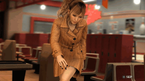 Maya Mori from Yakuza 4 picks up a bowling ball, wearing a leopard print coat in a bowling alley.