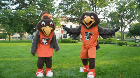 a couple of mascots with the letter b on their outfits
