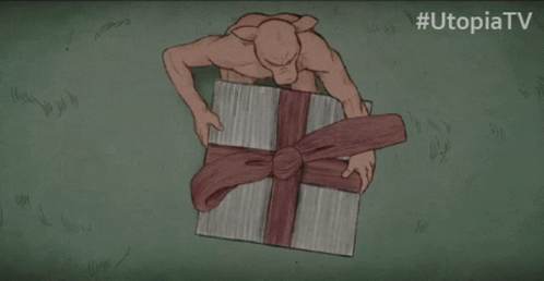 Animated sequence: a pig-like creature holds a gift box that transforms into a dice-like object, with #UtopiaTV.