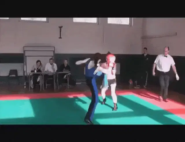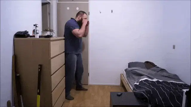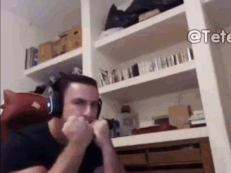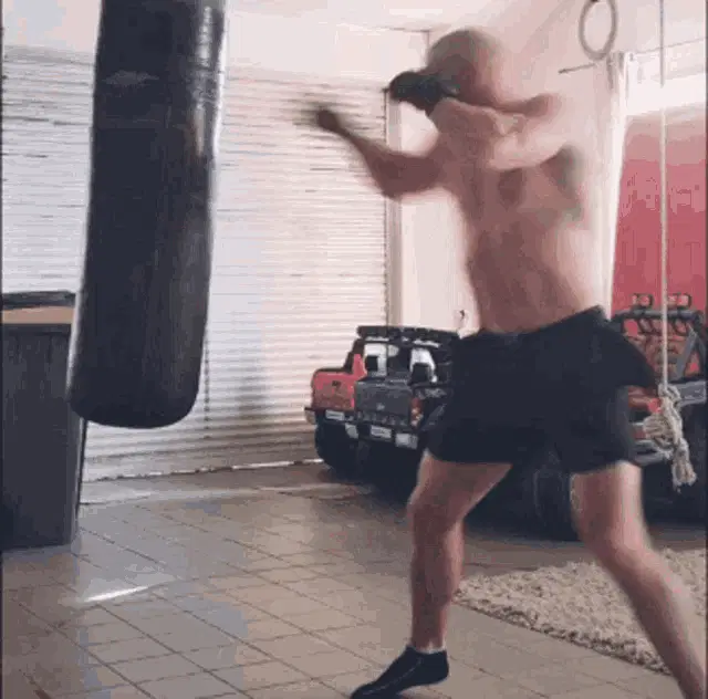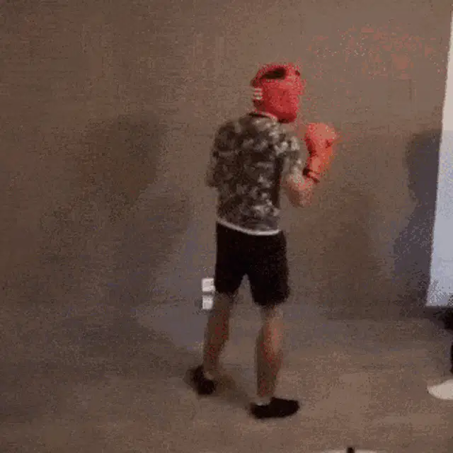 Super Xandao practices energetic boxing and punching moves while wearing headphones in front of a shelf.