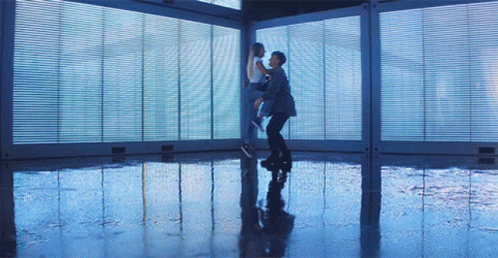 Johnny Orlando carrying a girl in a dance, surrounded by reflective blue windows.