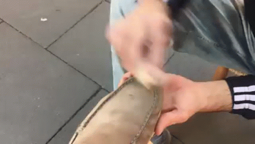 A person is meticulously cleaning a light-colored shoe with a cloth, holding it in their hands.
