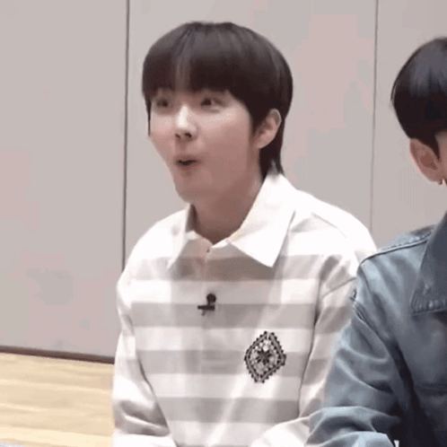 Boynextdoor's Woonhak shows a surprised reaction, covering his mouth before smiling, in a candid moment.