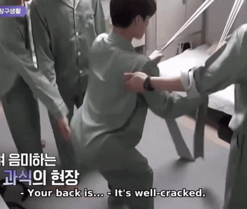 a group of people are standing around a man in a hospital bed and the words your back is it 's well-cracked