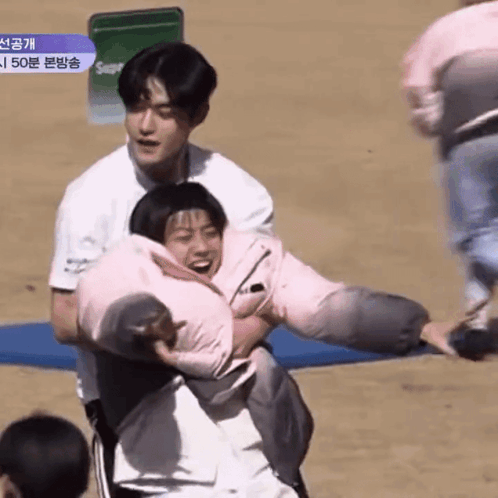 Jiwoong carries Keita in a playful bridal style during a game on Boys Planet, with Keita laughing.