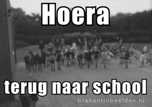 A black and white image of children running, with the Dutch text 'Hoera terug naar school' (Hooray back to school) overlaid.