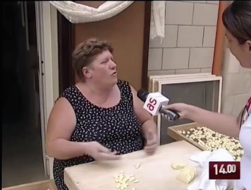 A woman passionately interviewed at a table with orecchiette pasta, likely in Bari, Italy.