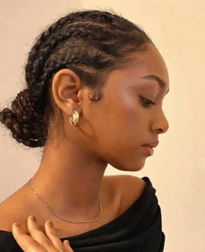 A beautiful woman showcases an elegant braided hairstyle, complemented by gold hoop earrings.