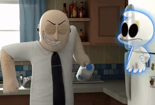 Max G from Brain Dump holds milk as a shocked ghost reacts in a kitchen setting.