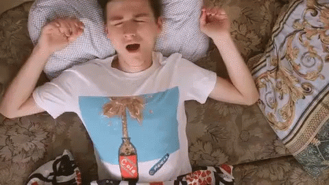 Brian Maps wakes up, yawns, and stretches on a couch, wearing a unique Cola t-shirt.