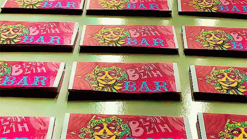 A collection of 'Blah Blah Bar' matchbooks, a recognizable prop from Brandon Rogers' comedy sketches.