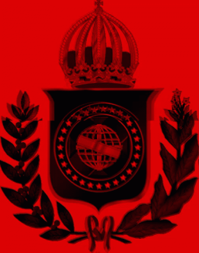 Brasão Imperial do Brasil em vermelho e preto, com coroa e louros, sobre fundo vibrante.