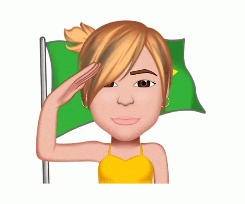 Animated avatar saluting with the Brazilian flag in the background, showing national pride.