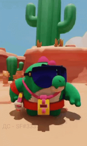 Brawl Stars character Buzz, a purple dinosaur wearing sunglasses, in a desert animation.