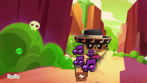 Brawl Stars character Poco plays a guitar in a vibrant desert setting, then sits down.
