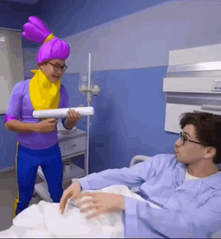 Kobyakov, dressed as Brawl Stars character Gene, pranks Vlad A4 with whipped cream in a hospital bed.
