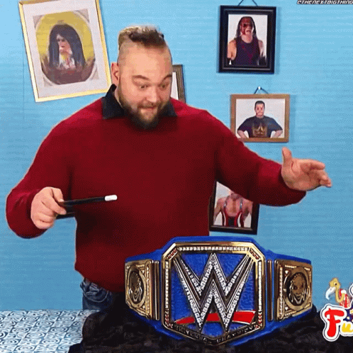 Bray Wyatt, in his Firefly Funhouse, reacts with shock and amazement to the WWE Universal Championship.