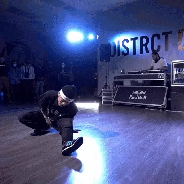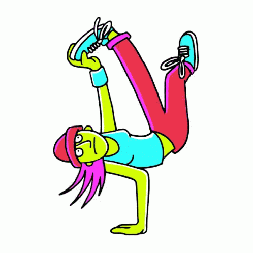 A vibrant cartoon animation of a girl performing an impressive breakdance handstand freeze move.